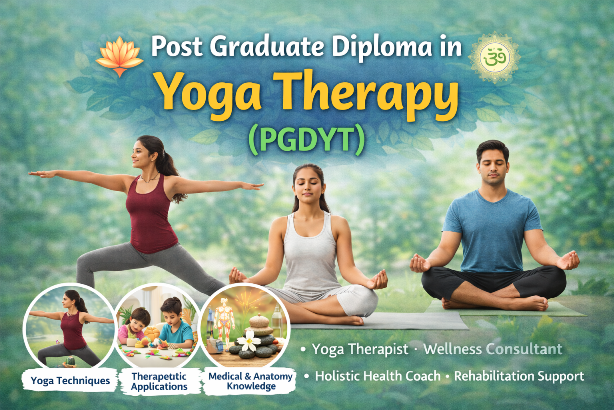 Post Graduate Diploma in Yoga Therapy. (PGDYT) It is a 1-year postgraduate diploma focused on yoga therapy — combining traditional yogic practices with applied anatomy, physiology & therapeutic techniques for health and wellness. The course is affiliated with Jagadguru Ramanandacharya Rajasthan Sanskrit University, Jaipur (JRRUS).